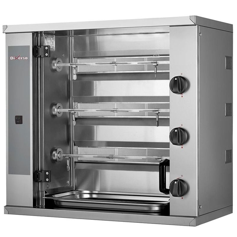La rôtissoire à gaz DIVERSO SMALL est conçue pour les professionnels exigeants qui recherchent efficacité et qualité de cuisson. Avec sa capacité de 9 poulets répartis sur 3 broches indépendantes, elle s’adapte parfaitement aux besoins des traiteurs, boucheries-charcuteries et restaurants. Fabriquée en acier inoxydable AISI 304, elle allie robustesse et hygiène, tout en offrant une cuisson homogène grâce à ses radiants céramiques et ses déflecteurs de chaleur démontables. Son design compact (800 x 400 x 735 mm) permet une intégration facile dans les espaces restreints, sans compromis sur la performance.