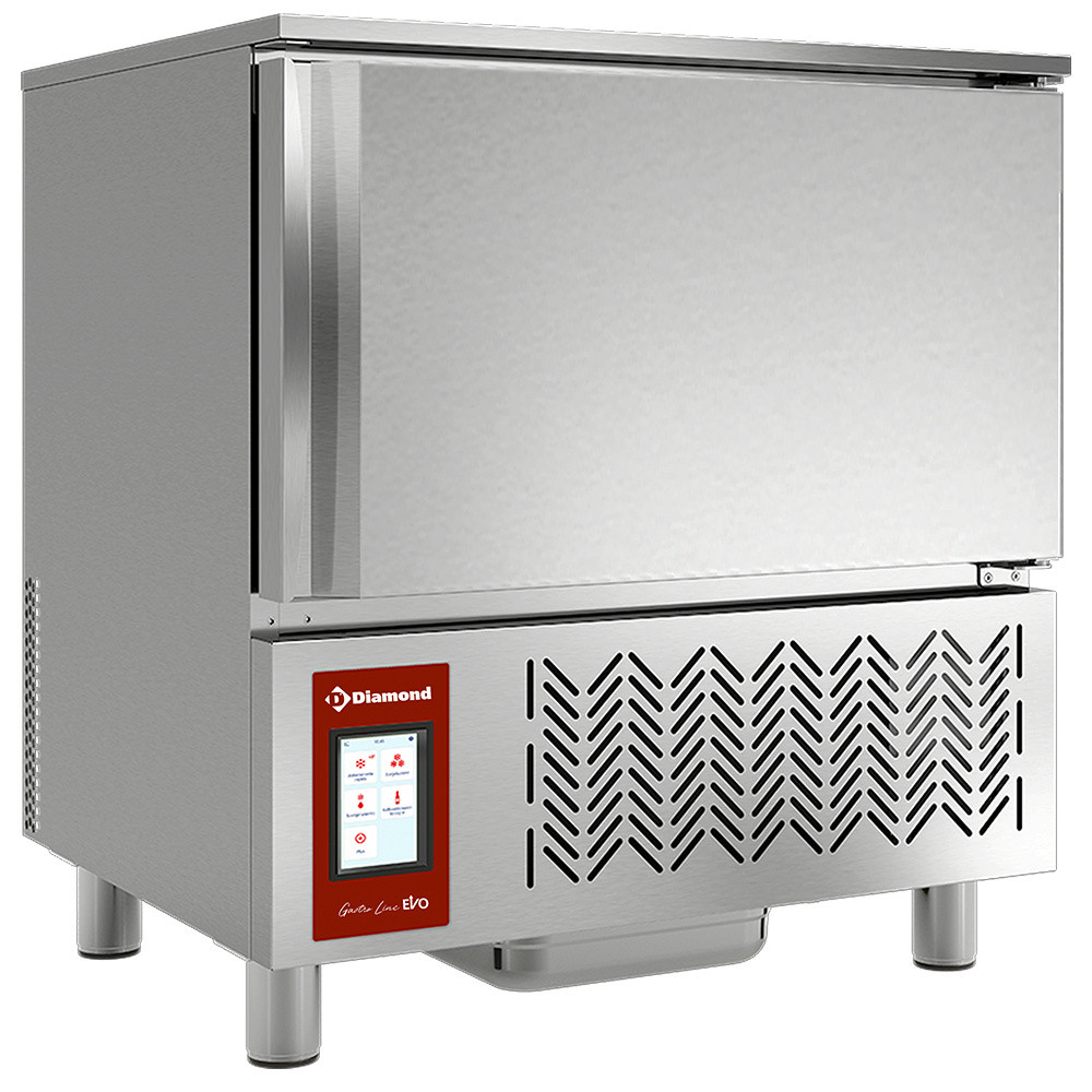 La cellule de congélation rapide DIAMOND CBT51/R2 est conçue pour les cuisines professionnelles exigeantes, où la qualité et la rapidité de congélation sont essentielles. Avec une capacité de 5x GN 1/1 ou 600x400 mm, elle permet de traiter jusqu’à 18 kg de produits par cycle en refroidissement (+70°C à +3°C) et 12 kg en congélation (+70°C à -18°C). Équipée d’un réfrigérant écologique R290 et d’une sonde à cœur, elle garantit une descente en température homogène et respectueuse des normes d’hygiène. Son écran tactile 4,3" offre un contrôle intuitif des cycles, tandis que sa structure monobloc en acier inox AISI 304 assure durabilité et facilité d’entretien.