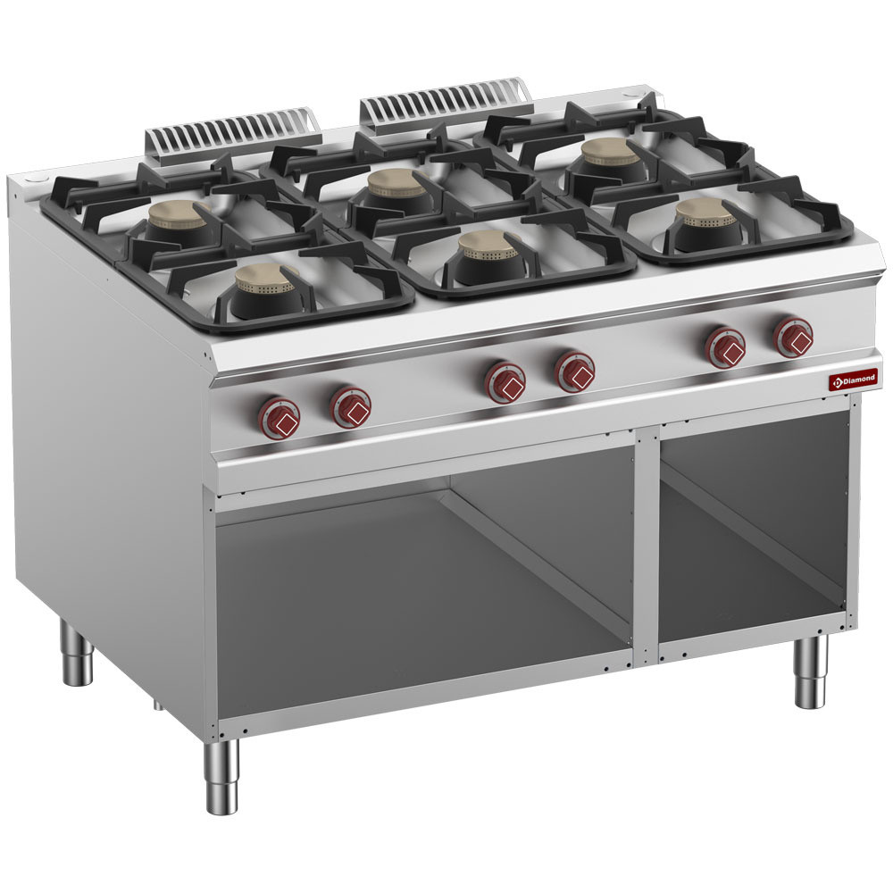 Le fourneau DIAMOND à 6 feux gaz avec armoire ouverte est conçu pour répondre aux besoins des cuisines professionnelles les plus intensives. Avec une puissance totale de 54 kW répartie sur 6 brûleurs haute efficacité (3 x 7 kW et 3 x 11 kW), il offre une flexibilité optimale pour toutes les techniques de cuisson. Son allumage par veilleuse et sa sécurité par thermocouple garantissent une utilisation fiable et sécurisée, tandis que son armoire ouverte compatible GN 2/1 + GN 1/1 permet un rangement pratique des plats et ingrédients. Parfaitement adapté aux restaurants, hôtels et collectivités, ce fourneau s’intègre facilement dans une configuration modulaire OPTIMA 900 EVO.