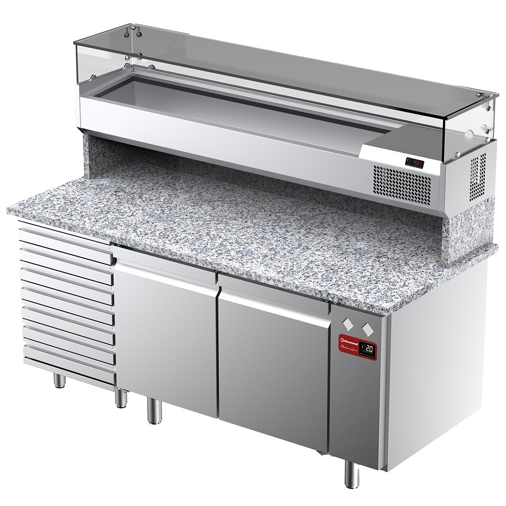 Cette table frigorifique ventilée DIAMOND est conçue pour répondre aux exigences des pizzerias et établissements de restauration exigeants. Avec ses 2 portes et 7 tiroirs, elle offre un espace de stockage généreux et organisé, idéal pour conserver vos ingrédients à portée de main tout en maintenant une température constante entre -2°C et +8°C. Son plan de travail en granit sarde de 1800 mm allie robustesse et élégance, facilitant la préparation des pizzas dans les meilleures conditions d'hygiène et de praticité. Entièrement réalisée en inox alimentaire AISI 304, cette table garantit une durabilité exceptionnelle et une résistance optimale aux conditions intensives d'utilisation.