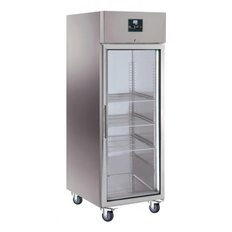 Entièrement fabriquée en acier inoxydable AISI 304, cette armoire réfrigérée allie durabilité et facilité d’entretien. Son traitement silicone intérieur renforce sa résistance aux chocs et aux variations de température, tandis que sa structure en inox intérieur et extérieur assure une hygiène irréprochable, conforme aux normes des cuisines professionnelles. La porte vitrée à fermeture automatique, équipée d’un joint magnétique et d’une serrure à clé, sécurise l’accès tout en permettant une visibilité immédiate du contenu.