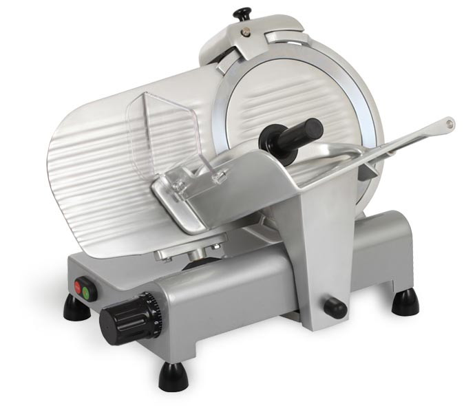 Ce trancheur se distingue par sa structure en aluminium anodisé, résistante à la corrosion et facile à nettoyer. Le protecteur de lame, le plateau et le chariot mobile sont également en aluminium anodisé, assurant une longévité accrue. L’arbre porte-lame, monté sur palier à billes double, offre une stabilité optimale pour des découpes précises. Son design compact (570 x 480 x 420 mm) et son poids de 24 kg facilitent son intégration dans les espaces de travail, même les plus restreints.