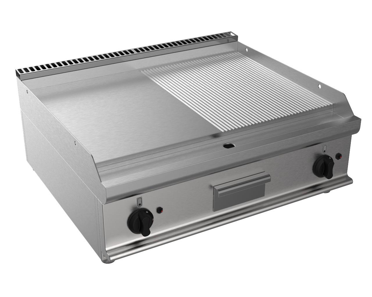Avec sa surface 1/2 lisse et 1/2 nervurée, ce fry-top s’adapte à toutes les techniques de cuisson : saisie, grillade, mijotage ou même cuisson lente. La puissance de 12 kW permet une montée en température rapide, idéale pour les services chargés, tandis que la plage de température réglable (100°C à 270°C) offre une précision parfaite pour chaque type de préparation. Les manettes et poignées en matériau athermique assurent un confort d’utilisation, même lors des manipulations fréquentes. Un équipement pensé pour booster l’efficacité en cuisine tout en garantissant des résultats constants et savoureux.