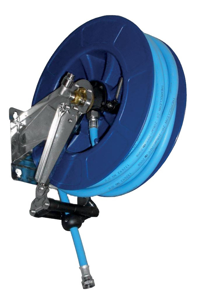 Le mécanisme de rappel est actionné par un ressort, avec un cliquet d'arrêt pour bloquer le tuyau à la longueur souhaitée.