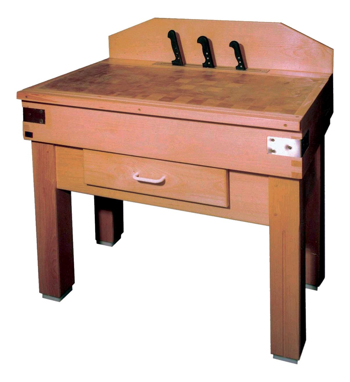 La fente, d’une profondeur de 100 mm, convient à la plupart des couteaux de boucherie standards. Elle est renforcée par une alèse en hêtre pour protéger les lames.
