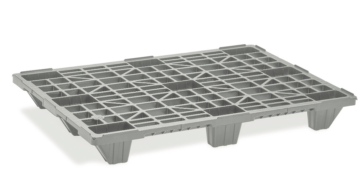 Lorsqu'elles sont vides, les palettes s'emboîtent avec une hauteur empilée de 40 mm par unité, ce qui permet un gain de place significatif.