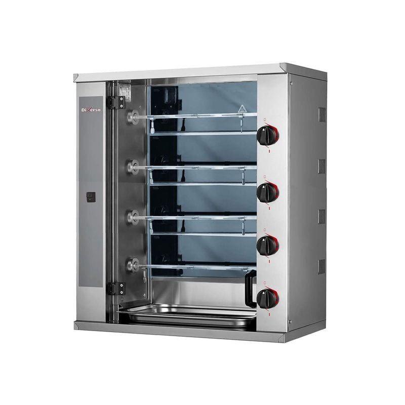 Cette rôtissoire vitrocéramique DIVERSO est conçue pour les professionnels de la restauration qui recherchent efficacité et gain de place. Avec ses dimensions réduites (800 x 400 mm de profondeur), elle s’intègre parfaitement dans les cuisines exigües sans sacrifier la capacité. Ses 4 broches permettent de rôtir simultanément 12 poulets, idéale pour les traiteurs, snacks ou restaurants à fort débit. Son système de chauffage vitrocéramique assure une cuisson homogène et rapide, tandis que sa construction en acier inoxydable AISI 304 garantit durabilité et hygiène.