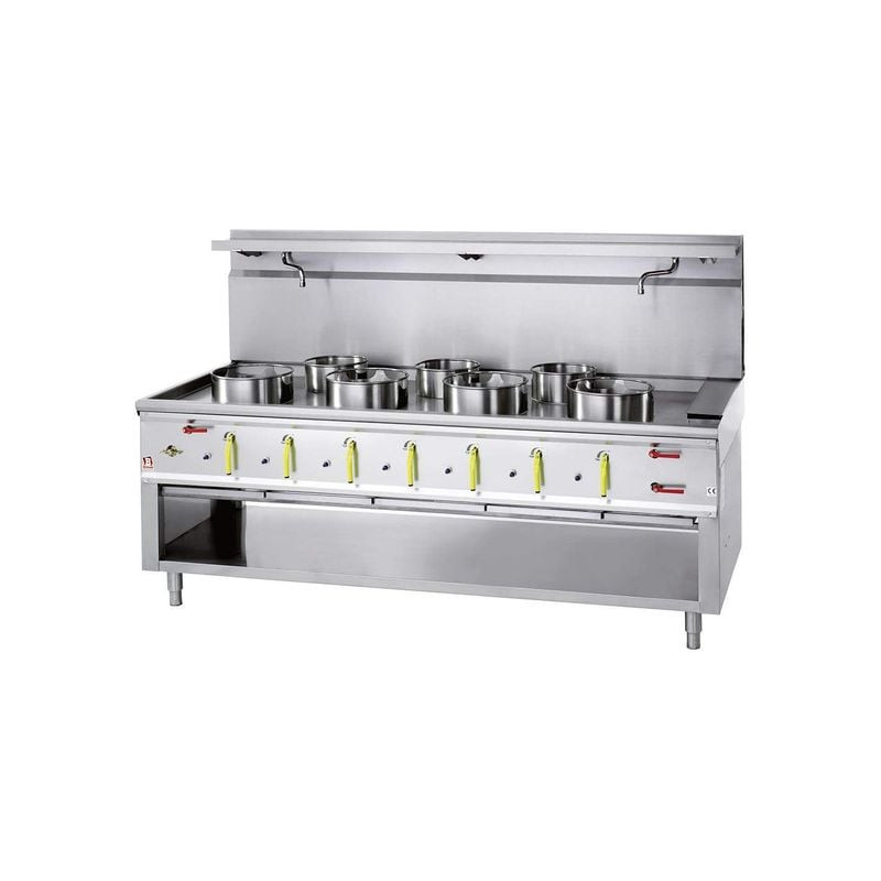 Ce fourneau wok à gaz DIAMOND est conçu pour répondre aux exigences des cuisines asiatiques professionnelles, où rapidité et efficacité sont essentielles. Avec ses 7 brûleurs wok puissants – 4 de 290 mm (21,44 kW) et 3 de 230 mm (10,13 kW) – il permet de préparer simultanément plusieurs plats sans compromis sur la qualité. Son plateau de cuisson embouti en profondeur, associé à des bacs d’égouttage inférieurs, facilite la gestion des liquides et des sauces, tout en maintenant un environnement de travail propre et organisé. Idéal pour les restaurants, traiteurs ou cantines, ce modèle allie robustesse et performance pour une productivité optimale.